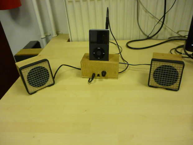 uno de los regalos para Navidad que me dieron fue este asombroso sistema de altavoces. No es en las baterías y las necesidades de alimentación. Tiene una manzana del muelle en la parte superior y una entrada de audio de 3,5 mm. También tiene un contr