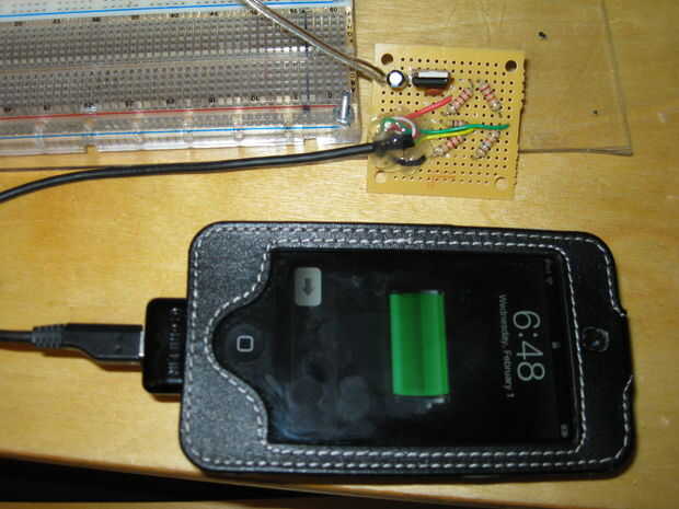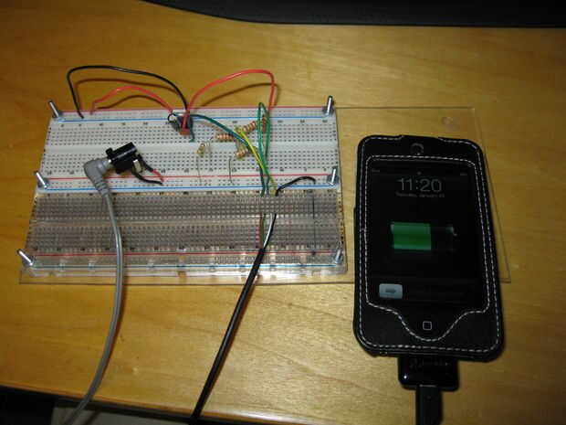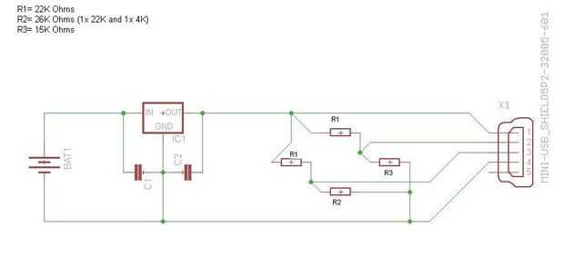 Conectado todo entonces fue acerca de las pruebas del circuito antes de conectarlo a mi iTouch. Asegurarse de que el D + (cable verde) fue en 2V y D-(cable blanco) era a 2.7V. He encontrado que el esquema de lo anterior mencionado instructable tiene el divisor de tensión hacia abajo. R1 debían provenir de la entrada de C.C. y necesidad de R2 y R3 conectados a tierra. De lo contrario las lecturas de voltaje en los pines de datos no estaba leyendo justo. Así que conecté todo mi esquema muestra como todos los measurments funcionados hacia fuera. Puesto que todo se veía bien enchufé mi iTouch y funcionó sin problemas. Incluso con la tensión en D - 2.27V solamente. Estoy utilizando un cable mini-USB de B como las que se encuentran en muchos de los teléfonos celulares. El conector de iPod que estoy usando es de un kit de carga y es un adaptador que se conecta a un cable mini-USB de B.