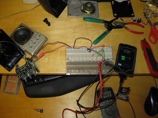 Antes de pasar todo a una junta que quería conectarlo a los altavoces y ver cómo el adaptador de pared maneja la carga de los altavoces y el cargador. Todo quedó alimentado con sobra. La tensión de salida del cargador fue 5.03V sin carga. Una vez que estaba conectado el iPod Touch sólo cayó a 4.93V. En general no está mal para un circuito tan básico. Puesto que todo lo extraído que estaba lista para el cargador a una Junta de soldadura. Pero no todo puede ir sobre el tablero todavía. Los cables USB y entrada de energía deban ser dejó hasta el montaje final.