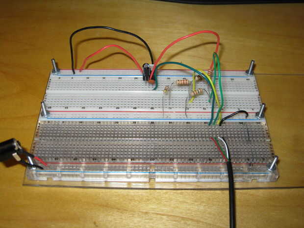 A continuación fui sobre la construcción de un circuito de carga para el dock del iPod. Usé un circuito muy básico con un LM7805. Rápidamente encontré que necesita más 5V entonces sólo va a los cables de corriente de un cable USB para iPod para cargar. Así que encontré un gran instructable sobre cómo conseguir tu iPod para cargar con el cargador de casa. Por lo que explotó mi breadboards así pude prototipo el circuito para asegurar que hacerlo bien. Parece ser asignar de golpe y se pierda con combos de resistencia diferentes personas han utilizado. Ya que no tengo la resistencia mencionada tenían valores estalló la confianza calc de divisor de tensión en mi iTouch y me fui sobre como encontrar a un buen combo con lo que tenía. Desde el instructable sabía que necesitaba 2V va en D + (cable verde) y 2.7V a la D-(cable blanco). Terminó con el siguiente basado en el 5.03V mis ofertas de circuito de carga de salida: