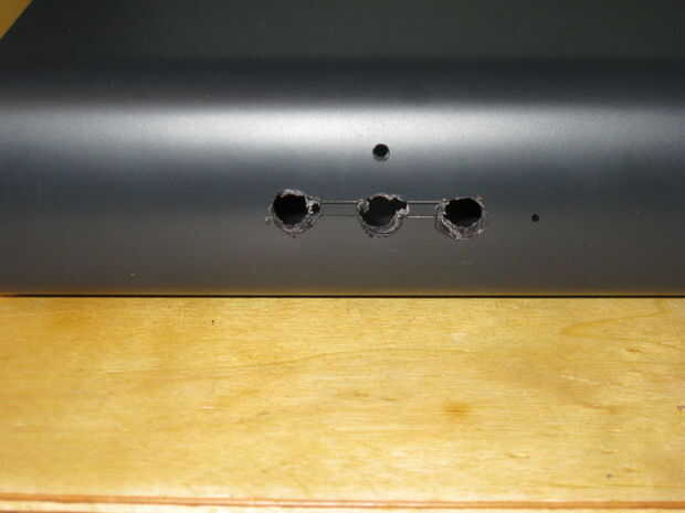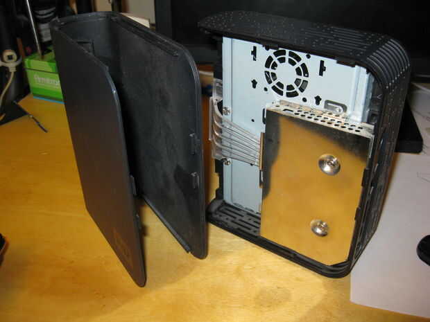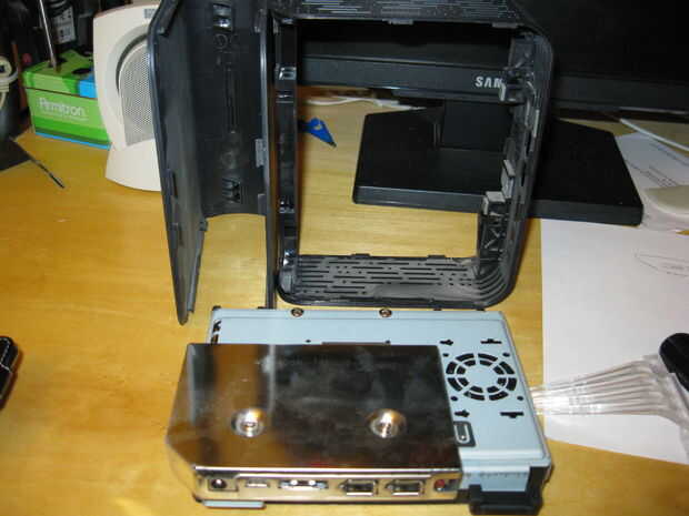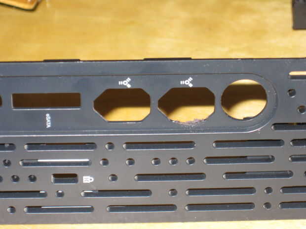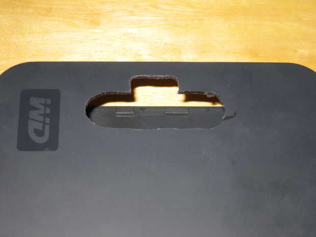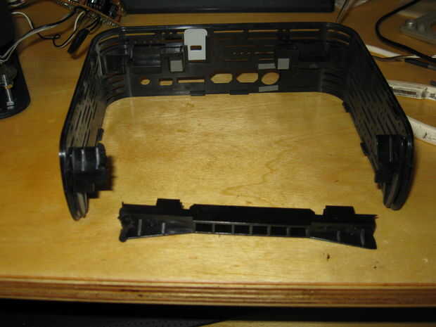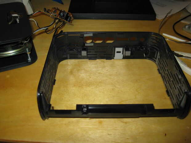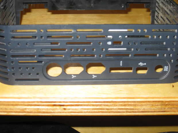 Última fue la contratapa sólo un par de mods necesarios aquí. Primero fue con mi broca Dremal y desplácese para cortar el refuerzo en la parte delantera. Luego un poco de relleno en uno de los agujeros para el puerto Fire Wire para el DC jack. El agujero del DC de la unidad contará con los auriculares para la entrada de un PC/portátil.