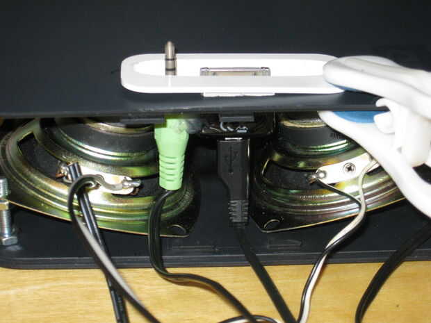 A continuación puse los altavoces en la parte inferior de la caja para perforar los agujeros 1/16" Guía para los tornillos que se mantienen en su lugar. Acabé de los agujeros con un 11/64" bits. Iba adelante y montar los tornillos en el caso que los altavoces. Cada tornillo debe 3 tuercas. 1 para mantener el tornillo a la caja y 2 pellizcar el altavoz en su sitio. Temporalmente montado los altavoces en lugar para me ayudar a medir la colocación de la base para iPod. Tuve que colocar la base ligeramente descentrado para dejar espacio a los conectores.