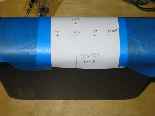 Para asegurarse de que obtener los orificios derecha de la placa he utilizado la parte frontal del altavoz original de la vivienda para hacer una plantilla. Luego usé una 1/16 broca para iniciar el centro de cada agujero. Sé que las fotos muestra un orificio para los auriculares en la parte delantera pero después de taladrar todos los agujeros de entrada me di cuenta los auriculares pegado hacia fuera demasiado lejos. Que sería imposible conseguir el amplificador a través de todo el camino. Por lo que fue quitado el enchufe del teléfono principal. Para el agujero LED acabado con una 1/8" bit. La voluntad de otros 3 agujeros perforados de 1/4". Ya que no tengo un taladro de broca más grande entonces 1/4" y más pequeño entonces 3/8" utilicé mis archivos para abrir los agujeros del resto del camino. Con acabado los agujeros que hice una prueba de ajuste para asegurar que todo alineado como corresponde. Entonces encontré el LED atascado hacia fuera demasiado lejos e hice mi mejor esfuerzo para mover tan lejos como sea posible. Me dejó apenas suficiente espacio para que los nobs podrían colocarse en los potes pero me obliga a utilizar pegamento caliente para montar el tablero en el caso en lugar de una tuerca en las macetas.