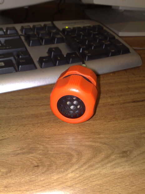 es un altavoz portátil muy simple de un adaptador de manguera de jardín.