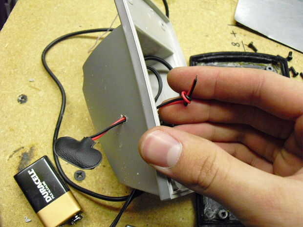 Si todavía no lo has hecho, perfore un orificio en el caso donde marcaste anteriormente e Inserte el clip de la batería. Haga un nudo para mantener la tensión de los empalmes de la soldadura. Ahora soldar en algunas extensiones para que el todo es más fácil trabajar con.