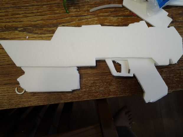 Pegar las partes de detalle a las piezas sin disparadores entonces Fije la pieza con un disparo en medio de los otros dos. Ahora debe ser 5 pedazos de tablero de la espuma gruesa.