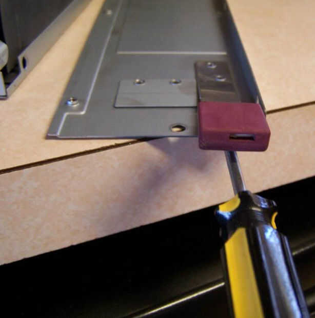 2. Utilice una broca de aproximadamente dos veces el tamaño de los agujeros sujetándolo en. Taladro hasta que golpea el metal brillante de la palanca. Levante la palanca con una cabeza plana. Puede simplemente sáquelo sin taladrarla, pero corre el riesgo de doblar la cubierta.