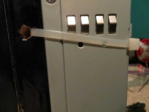 Luego perfore un agujero correspondiente hacia abajo hasta que el orificio lateral que ha perforado. Quitar todas las virutas de madera y aserrín del agujero. Enrosque una amarra por el agujero que ha perforado apenas un segundo atrás. No pasará de la otra manera (por el lado de la madera) porque la brida tiene que doblar para obtener la vuelta de la esquina. Añadir otra amarra a la amarra porque sola no sería tiempo suficiente para envolver alrededor de la fuente de alimentación.