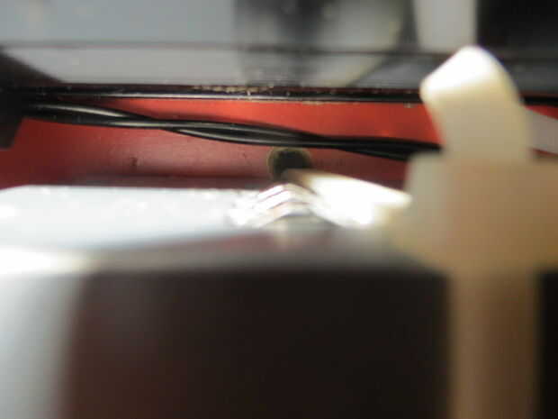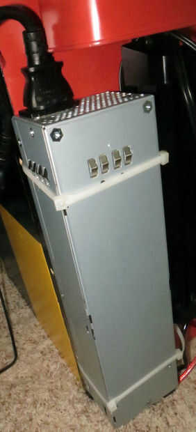 Hay otras maneras de conectar la fuente de alimentación, que es la única manera que tuve no requieren ir a la tienda y comprar un soporte u otra cosa. Además de los lazos zip mantienen en muy bien! Poner la fuente de alimentación del panel posterior con el enchufe hacia arriba; pero no hasta que no se puede quitar el enchufe de alimentación en el futuro y que los cables en la parte inferior que soldado en no tocan el suelo. Ver fotos. Una vez que el adaptador de red está en su lugar final, martillo un clavo ser la parte inferior del panel posterior para que la PSU no se deslice hacia abajo. Doblar las uñas que mantiene la fuente de alimentación en el lugar con algunos plyers.