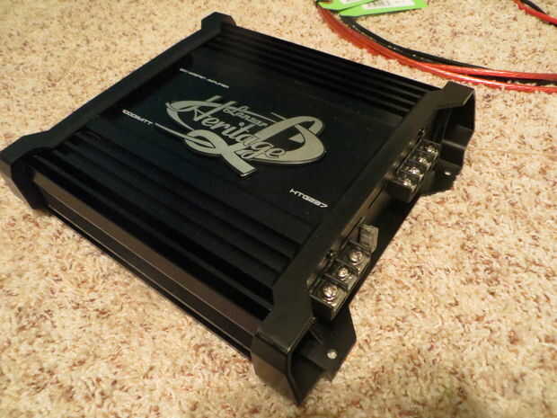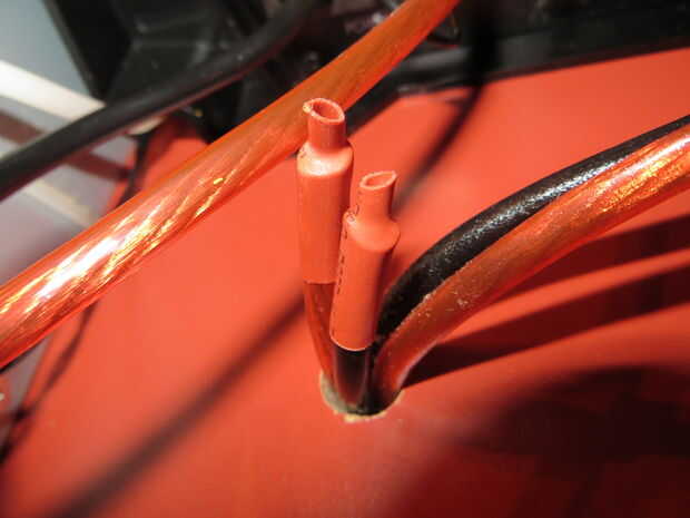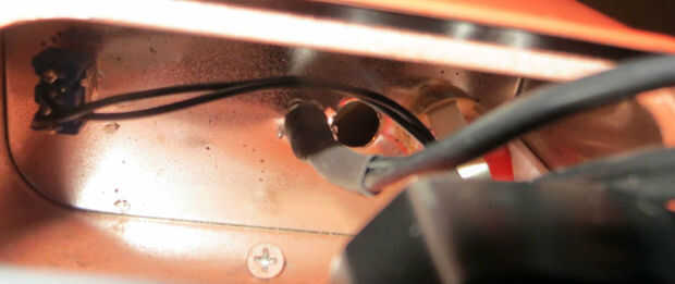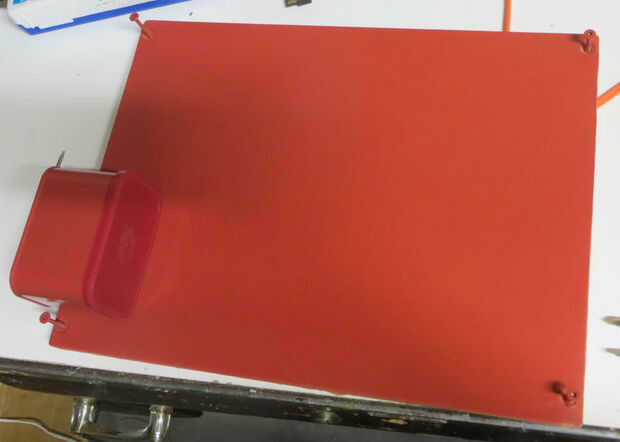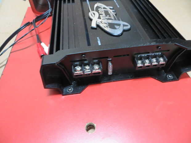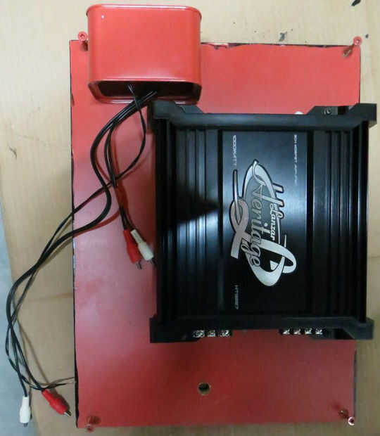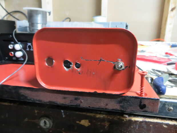 Mientras que la pintura se está secando, se puede trabajar en la parte trasera. Aerosol pintado rojo del panel posterior. Averiguar cómo vas a colocar todo como amp, fuente de alimentación, orificio para cables a y la caja de control. Taladre agujeros guía para todo. Usé una lata de café para la caja de control. Había soldado un interruptor y 1/4 jack y jack de 3,5 mm para la caja. Taladré un agujero para cada componente. Asegúrese de volver a la bandeja de metal con algo parecido a madera por lo que no corte el metal en vez de hacer un agujero limpio. Se puede ver un agujero que hice el tamaño incorrecto en el cuadro. He arreglado añadiendo una funda de espuma para que no se puede ver error. La caja en el tornillo. Ir en un ángulo de manera que usted puede sujetar más firmemente. (significa que puede colocar tornillos más lejos en el cuadro de que si fue un ángulo bajo). Conecte el amplificador y asegúrese de que el sentido de cable (conectado al interruptor anterior agregamos para que usted puede encender y apagado) permanentemente la conexión porque quería apagar el hambre de alimentación psu, no el amplificador. Perfore un agujero de 1/2" para los cables pasar a través.