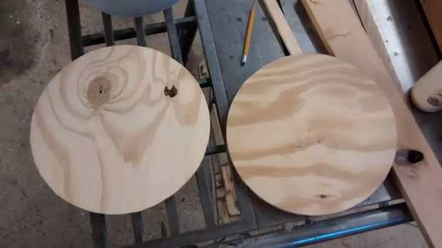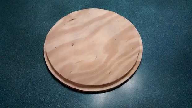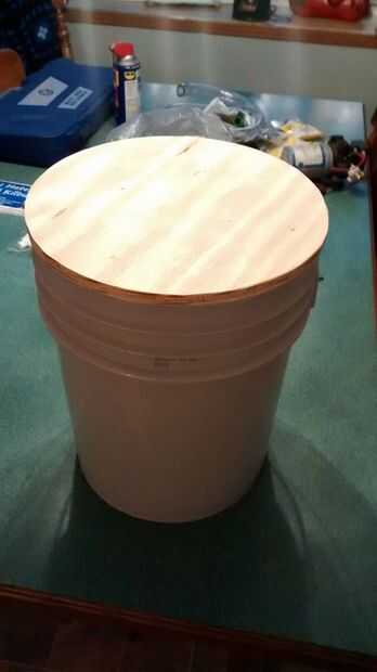 Hice una tapa de madera contrachapada para una cubeta por cortar dos círculos, uno ligeramente más pequeño que el interior del cubo y uno ligeramente más grande que el exterior del cubo. Luego pegar y grapar los dos círculos juntos y tuve una agradable superficie sólida para montar mi bomba y las tuberías.