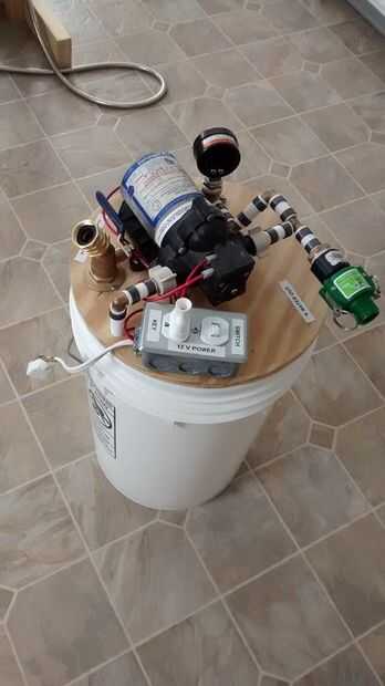 Terminé con una bomba que puede bombear de un cubo o cualquier otra fuente exterior simplemente cambiando unas válvulas. Bombeará a una variedad de fuentes. Produce 45 psi de presión de agua, y ahora tengo agua corriente cuando camping para mi plato lavarse y ducharse...