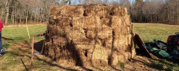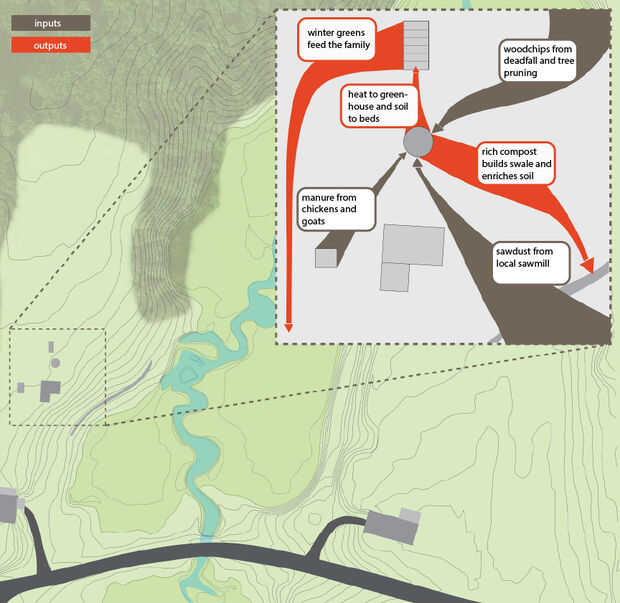 El montículo del dolor es una pila grande de biomasa leñosa, también conocido como abono. Inventado por el agricultor francés Jean Pain en la década de 1970, se hace de virutas y serrín, rodeado por un anillo de balas de heno para la estructura y aislamiento. Como se descompone el montón de dolor, calor es producido y utilizado utiliza un circuito hidráulico. El montículo de dolor producirá calor hasta por 18 meses, después de que tiempo los restos (nutrientes ricos, tierra humus) pueden utilizarse para construir el suelo.