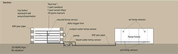 El montículo de dolor puede utilizarse para calentar bañeras de hidromasaje, invernaderos o sistemas de calefacción hidrónica. Planificar su ubicación cuidadosamente antes de tiempo para que estés cerca de la cosa que se calefacción. En el diagrama mostrado aquí, tenemos conectado un montón de dolor a un invernadero. Enterramos a las líneas de agua para que no perderíamos calor al aire exterior.