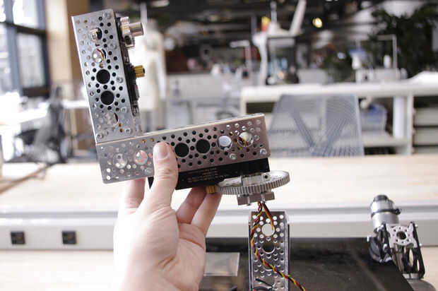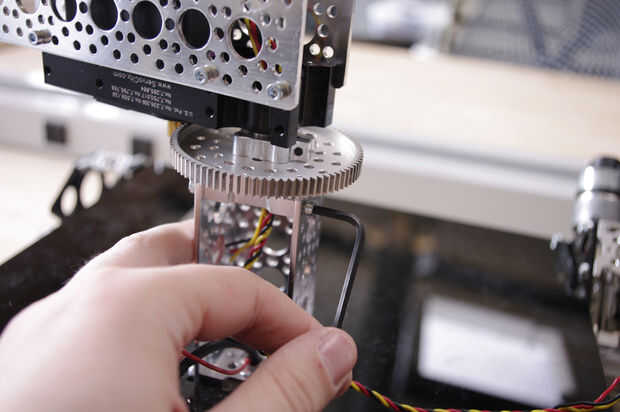 A continuación, pegue el soporte de montaje D cuádruple eje de 90 grados a la parte superior interna de la perpendicular de protroduing de extrusión de aluminio de la base.