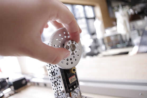 Colocar el engranaje en el eje de la Asamblea de servo HS-5485HB torno. También colocar en el adaptador del cubo 0,77".