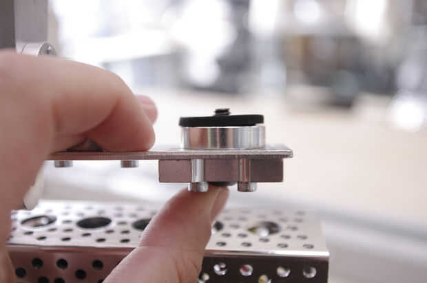 Inserte un perno de 3/8" para arriba a través del montaje de núcleo cuádruple y espaciador de cubo para bloquear la cámara en el lugar.
