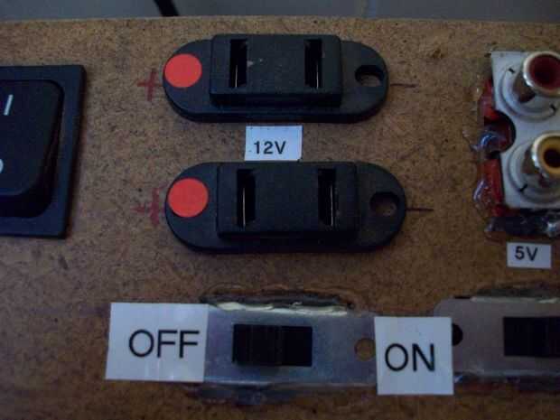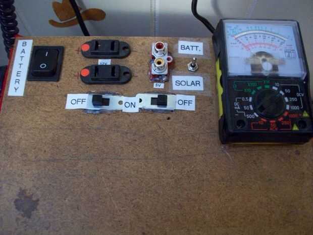 En las 3 primeras fotos vemos la parte superior de la caja de batería. Es abatible y la tapa alberga todos los interruptores. plug-ins y algunos cables. El resto del cableado se encuentra detrás de la batería dentro de la caja. En la parte superior de la tapa se puede ver el interruptor etiquetado como "batería" que desconecta totalmente la batería desde el controlador de carga. Al lado de eso es de dos plug-ins que son 12v y el interruptor debajo de ellos ambos apaga. Y los pequeños puntos rojos indican el (+) terminal positivo. Lo mismo sucede a los dos enchufes del RCA, son 5v y la apaga ambos. Pero con el pluge RCA, el centro es el (+) terminal positivo y el exterior es (-) negativo. El pequeño interruptor de palanca a la izquierda del medidor controla lo que dice el medidor.