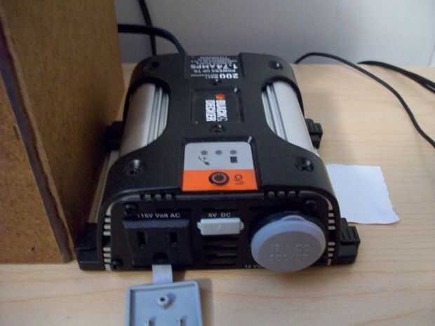 El inversor que utilizo es un 200 vatios continuos, 400 vatios pico inveter y puede suministrar hasta 1,74 amps como se puede ver en la primera foto. En la segunda foto puedes ver el encendedor de cigarrillos del enchufe que es lo que conecta mi inversor con mi batería. La toma del mechero ves también se une al 2, plug-ins de 12v en la parte superior del cuadro, y en cuando se apague descrito anteriormente, esta toma también se apaga.