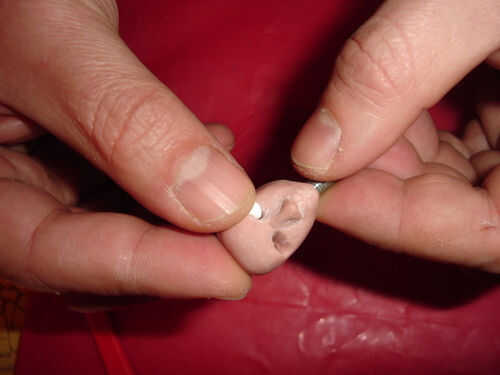 Para la cabeza primero sólo esculpida la parte de piel de color, con zócalos del ojo con una selección de diente. Puede envolver la grupa al horneada y lijada con papel de aluminio para permitir la colocación de la cabeza, pero otra vez elegí para perforar una cavidad después de la cocción de la cabeza.