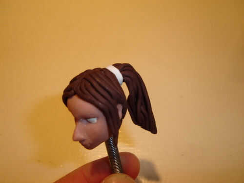 Cuando la piel de la cabeza de color estaba continuó con ojos y pelo. Para esta figura, para ser coloreado con rotuladores de fieltro, solo hago la parte blanca del ojo, empujando una bola blanca de Fimo en el zócalo, aplanar ligeramente. No añadir un iris, cejas o color de labios permitirá diferentes colores y a un grado incluso expresiones para aplicarse con los marcadores de fieltro. Para que el cabello trajo primero una capa delgada del color deseado y entonces el pelo sí mismo con rollos finos. Para algunas figuras que hice antes, utilicé colores de pelo diferentes (tonos cercanos unos de otros), sólo parcialmente mezclan para dar un aspecto más realista. Esta figura que no lo hice, como este efecto puede también lograrse con los marcadores de fieltro. Se podría pensar en hacer pelo blanco, lo que permite aplicar cualquier color de pelo con los marcadores de fieltro, pero sería muy difícil de color en las profundas brechas entre los filamentos del pelo. La cola de caballo rompió más adelante, que me dio la idea de unir con un imán también. Esto le permite "seguir gravedad" cuando la cabeza está inclinada y también puede convertirse en una base de postizos intercambiables.