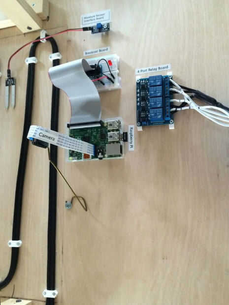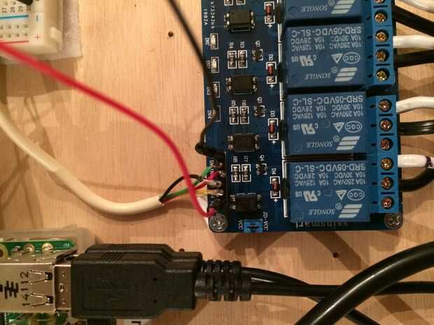 Un paso muy importante fue conectar los cables de la salida de la banda hacia el relé de la placa de relé. La segunda imagen muestra el poder, tierra y los cables de control en el lado de la entrada de la placa de relé. La última foto muestra cómo el breakout junta después de alambré mis 2 entradas (sensor de temperatura del suelo y sensor de humedad del suelo) y 4 salidas (los controles de relé) el Raspberry Pi. Parece complicado pero no lo es realmente.