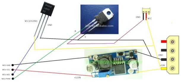 Soldar un cable de puente entre los dos negativos de MCU fuente de alimentación CC/CC para equilibrar las corrientes de tierra así que el MCU puede leer la temperatura correctamente. Añadir un LED externo con una resistencia de 470 ohm para monitorear el error del controlador P. Si se enciende, funde su negativa, si se apaga el ventilador y su positivo.