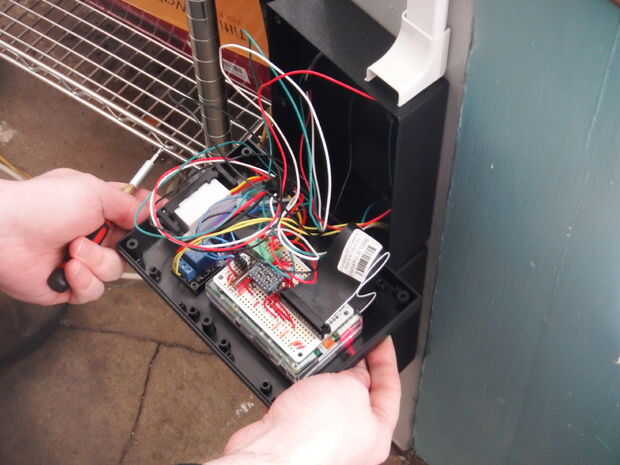 Había montada todo en las cajas con notas adhesivas de espuma de doble cara y los orificios perforados para que los cables pueden entrar y salir. Necesidades de la fuente de alimentación 120V CA, usamos un conectador estándar IEC. Puede ser cableado con conducto, si usted elige esta ruta, asegúrese de que usted sabe lo que estás haciendo o contrate a un electricista competente. Cable de los 12V y GND de la fuente de alimentación para el convertidor de DC-DC de 5V y utilizar la salida del convertidor para alimentar la placa, de la terminal de resorte que usted conectado antes. MENTE su polaridad - esto equivocarse será probablemente freír algo. No alambre de los terminales del relé para empujar y GND de la fuente de alimentación. La huelga de alambre NC y COM en la alimentación.