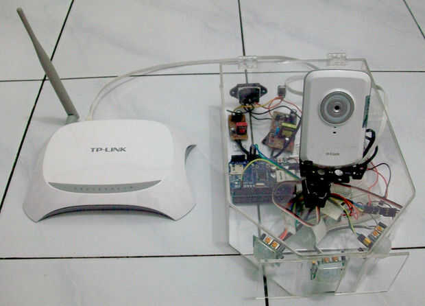 Porque este proyecto fue parte de mi proyecto final de carrera para la Universidad, hice la caja de acrílico con formas extrañas (por alguna razón). La caja como se ve en la figura anterior, puse el Arduino Ethernet shield y el adaptador de corriente (para Arduino) dentro de la caja. El servo también fue unido en la parte superior de la caja.