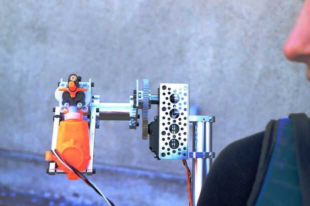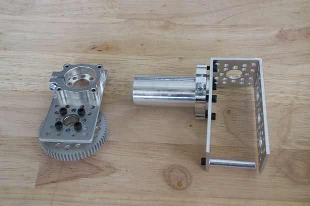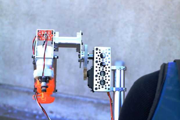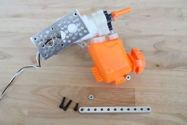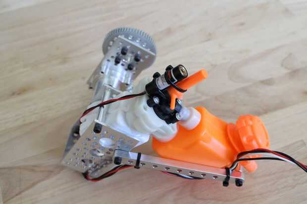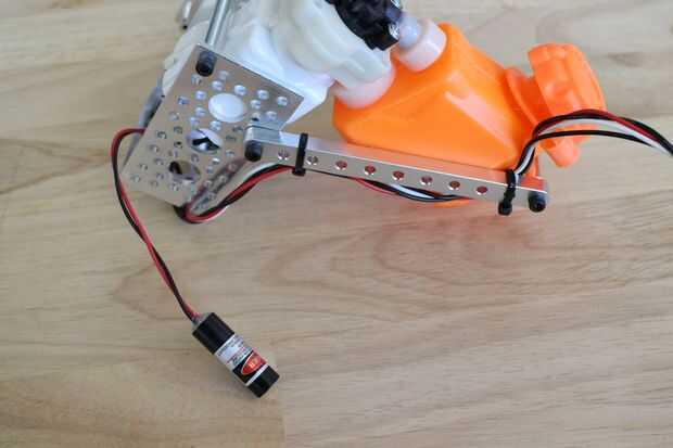 Conjunto de la pistola de agua se monta encima de y lejos de los servos y electrónica principal para que todo limpio y seco. Debe derramar el depósito mini, no puede llegar el servo o el hombro del usuario. El mecanismo de la pistola de agua se lleva a cabo en el lugar, apretados dentro de una pieza de soporte de canal A. El depósito se apoya en dos vigas que unida al canal así. El láser se une a la parte superior del pico con un par de abrazaderas de plástico. El láser y los cables de alimentación del arma se extienden por 30 pulgadas así. Cable de alimentación de la bomba es rojo (el cable naranja izquierda está desconectado) y suelo se suelda directamente a la placa de tierra (elástica) de batería.