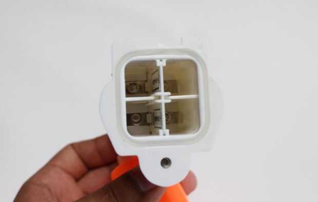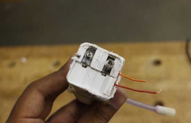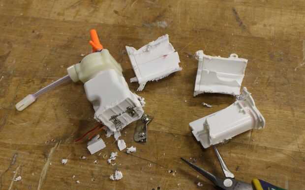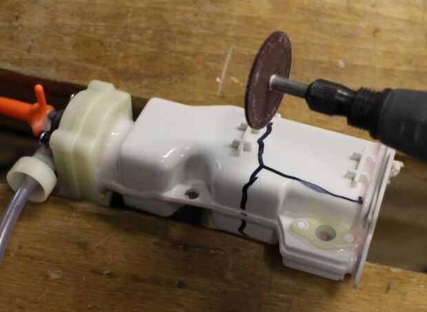La pistola de agua fue diseñada para ser alimentado por 4 pilas AA en serie, pero esto también es bastante pesado, así que opté por simplemente para ejecutar 6ish volts hacia el motor (más ahorro de peso). Para mantenerla compacta, marque el borde del compartimiento de las pilas y dremeled lejos el exceso de plástico. Asegúrese de pescar los cables del interruptor (rojo y naranja).
