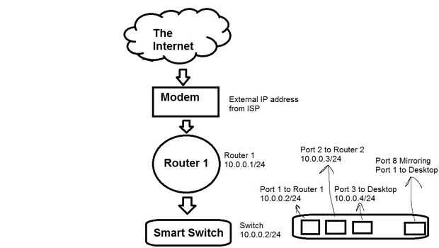 Conecte su primer enrutador y el módem y utilice 10.0.0.1 o cualquier otra dirección IP interna como su puerta de enlace pero ten en cuenta que tendrá que usar un rango IP interno separado del siguiente router.
