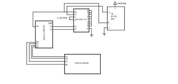 Después de hacer esto que usted necesita enviar datos sin cables. Sólo tiene que conectar 13 y 12 patillas de arduino a la 13 y 12 del codificador (HT 12e) consulte el diagrama del circuito que lo postee y hoja de datos en este enlace. y conectar el pin de 17th(OUTPUT) con el transmisor (módulo de RF).