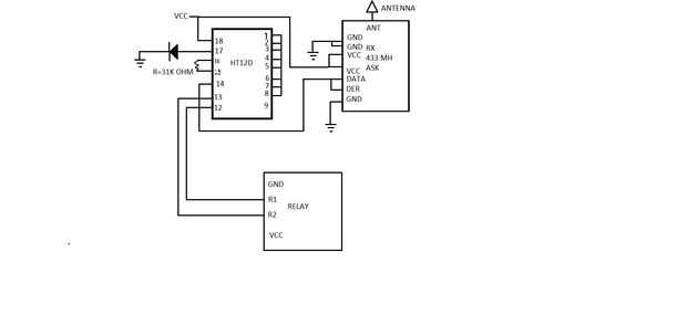 Llegado al lado del receptor. Es muy Simple. basta con conectar el receptor del módulo de RF con decodificador que se decodifica los datos recibidos procedentes de transmisor. Conectar el pin de datos del módulo de RF con el número del pin 14 del decodificador y salida del decodificador del pin 13 y 12 para el relé. No se olvide que aquí la Vcc es de 5v.