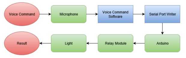Pero otra voz había controlada por domótica!Como se muestra en la imagen, el sistema puede controlar cualquier aparato eléctrico, encender o apagar, que está conectado a la toma de corriente. El sistema lo hace mediante comandos de voz a medida. El s