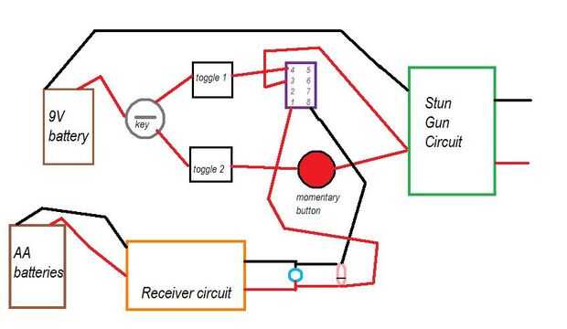 Según el diagrama a continuación, suelde el alambre del contacto del relé #4 a uno de los contactos del interruptor SPDT. Soldar otro cable desde el segundo contacto en el botón de ir a uno de los contactos del interruptor de llave. En esta misma llave de contacto, soldar otro cable que conduce a un contacto en el segundo interruptor. Soldar un cable desde el recambio en el segundo conmutador a un contacto en el botón momentáneo. Soldar otro cable al contacto repuesto el botón momentáneo para el terminal positivo de la pistola de aturdimiento.