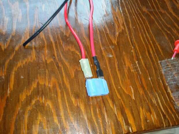 Como el alambre ya tenía lámina conectores que caben un gran 60 Amp fusionan que tenía yo sólo coloqué en línea en el lado positivo. utiliza cinta aislante para asegurar que no inadvertidamente un cortocircuito en el - lado. No utilice un fusible de cuchilla tipo automotor como usé el fusible de la lámina industrial. El calor generado puede derretir cualquier encogimiento de calor y provocar un cortocircuito si no es en un portafusible apropiado.