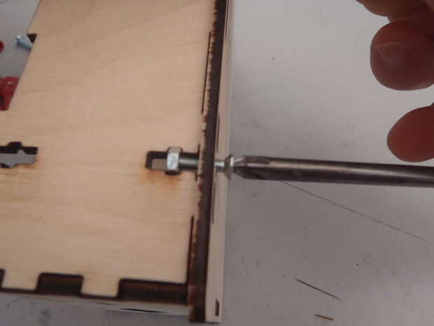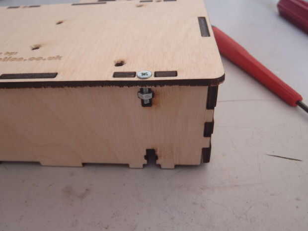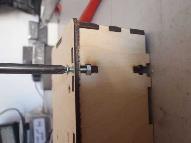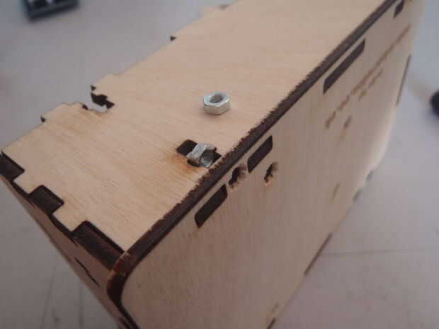 El recinto se mantiene Unidos mediante muescas y soportes de tuerca. Esto funciona muy bien. Creo que lo vi primero en una edición de la revista Make.