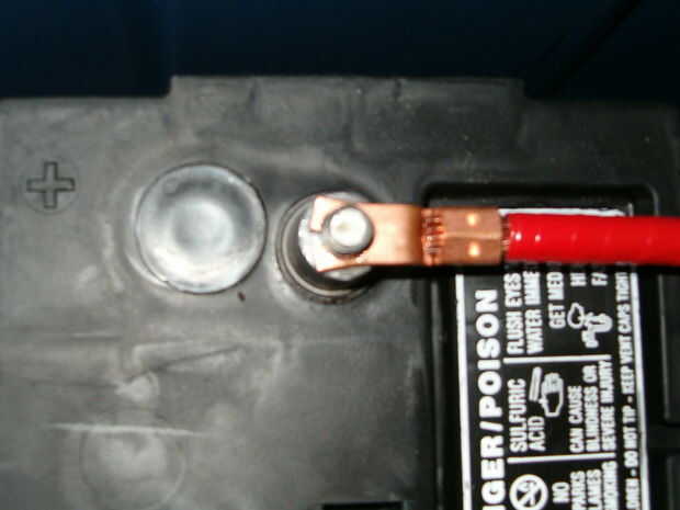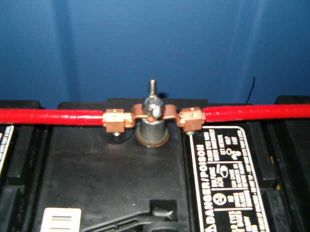 Medir entre los terminales y el cable cortado a la longitud. A continuación añadir las zapatas mecánicas. Puesto que los terminales de la batería eran un poco más grandes que los agujeros en las lengüetas que compré los perforé para adaptarse.