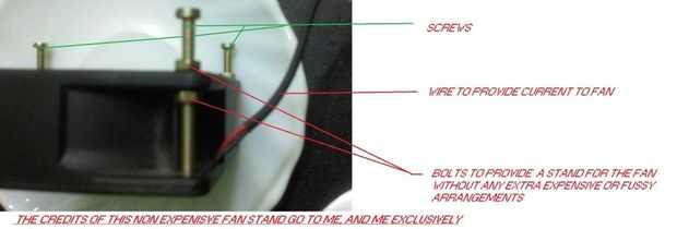Por supuesto por debajo de la laptop... sin necesidad de taladrar un agujero grande en su mesa... Levante su portátil unas pocas pulgadas por libros o bujes de caucho disponible en el mercado,,, lugar el ventilador en un ducto que suministra aire al RAM o de cualquier otro crees que se calienta demasiado... no demasiado.. .el flujo de aire es torpe... mantener a 1 centímetro de la base del ordenador portátil