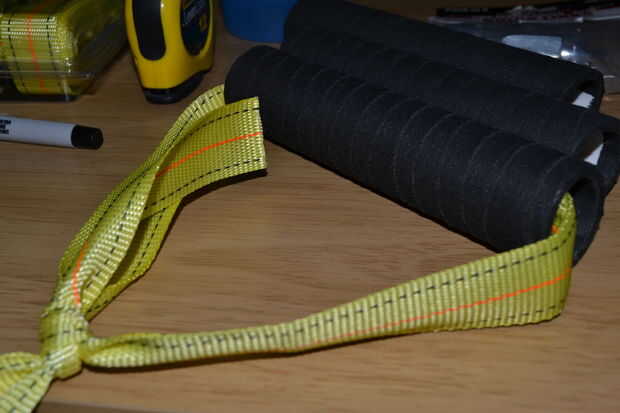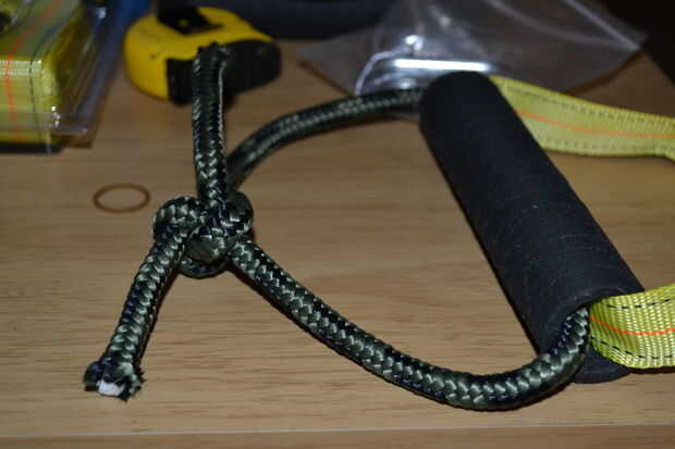 Para las manijas, marqué de 24" de correa en incrementos de 6". Yo entonces alimentó a través de la empuñadura para que 12" sacó del final (6" permanece en el mango, para que 6" de marca de cuerda todavía está en el otro lado). En el primer marcador de 6" y el último había atado un nudo as de guía, asegurándose de que los marcadores se mantuvo justo en el punto que el nudo comienza en ambos lados para el mango son todos idénticos en tamaño. Luego lo hice con los otros mangos.