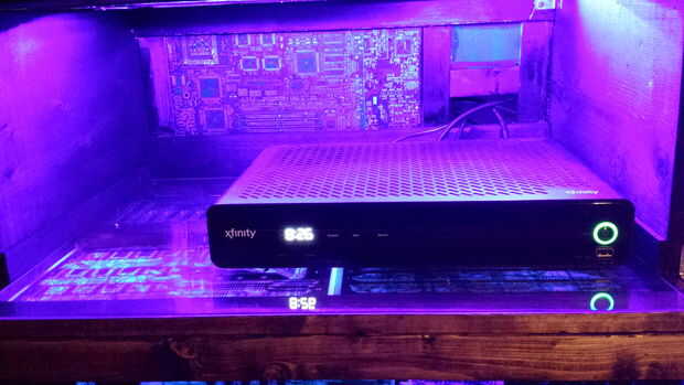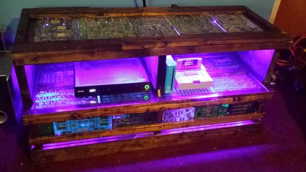Yo no pegue en el plexiglás, pongo algunos moldeado en la parte superior en los lados y clavo había asesinado en. Así que si necesito limpiar debajo del estante, o quieres añadir algo, se desliza hacia fuera. Tesis las luces funcionan como luces negras así que podría extraer el plexi-glass y añadir algunos pintura sensible de blacklight. Por el camino del curso.