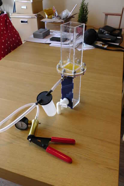 Las partes principales del sistema de filtración son un embudo para la muestra de agua, una placa perforada plana para el papel de filtro, un vaso para captar el agua filtrada y un sistema para la aplicación de algunos de presión para acelerar el proceso. Para aplicar presión que tengo una bomba de vacío que se supone para ser utilizado para purgar frenos de coche. Funciona perfectamente y cuesta menos de £15 (digamos $20) on-line. Recomiendo conseguir algo como esto si están filtrando agua particularmente sucias o utilizando papel de filtro con un tamaño de poro pequeño.