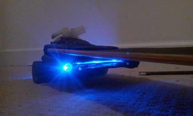 El sistema de frenos utiliza jeringas como frenos hidráulicos y barras de led azul como las noches alimentadas por una batería de 9v