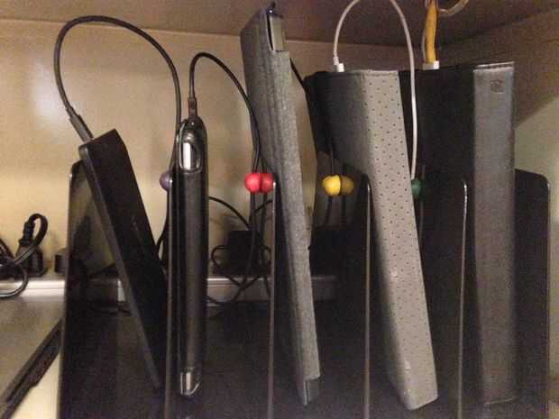 Trabajo en una institución donde tenemos un gabinete lleno de dispositivos... y por lo tanto, un gabinete lleno de cables desordenados y. Con unos materiales muy sencillos, me hice un sistema de gestión de cable para sujetar un número de nuestras tabletas y los ereaders, ensuciar-libre!