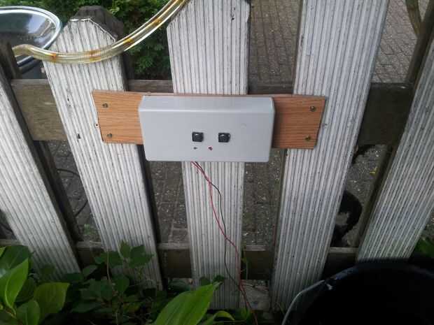 Ver la imagen de arriba el resultado: la unidad se atornillan en una pequeña placa de madera y conectada a la cerca del jardín. El cubo está situado junto a él, y dos cables poco plomo hacia la bomba sumergida. La bomba entonces suministrará el agua a una manguera pequeña con algunos jefes de gotero.