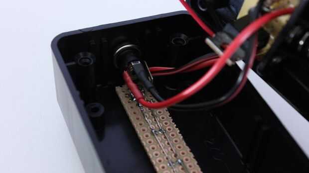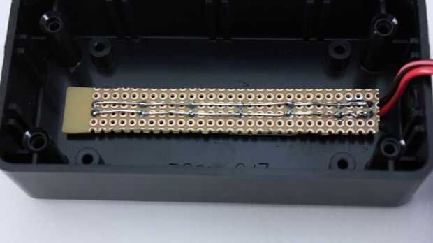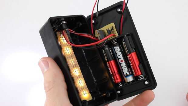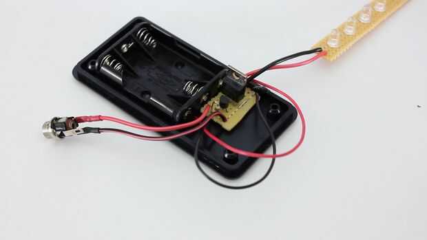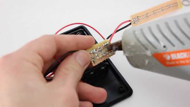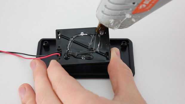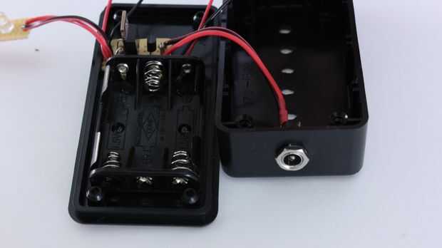 Ahora usted está listo para montar todas las piezas en el interior de la vivienda. Empiece por aplicar pegamento a la parte posterior de la batería y montaje en su lugar. A continuación pegar la placa de circuito en el lugar. Luego inserte el conector de alimentación de CC en su agujero y fíjela con la tuerca. Por último pega en la matriz de LED. Antes de instalar cada pieza, colocarlo en lugar para asegurarse de que no llegó a cualquiera de los otros componentes. Una vez montadas todas las piezas, introduzca las baterías y cerrar la caja.