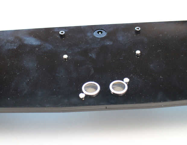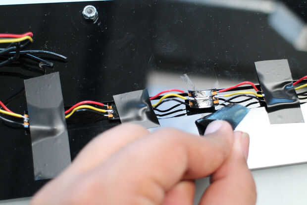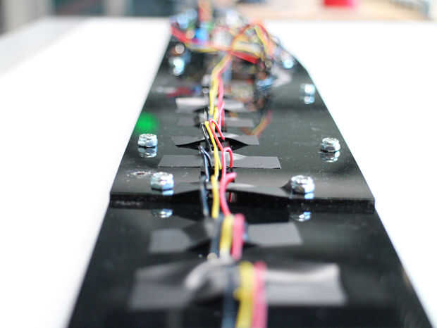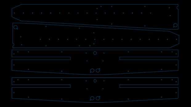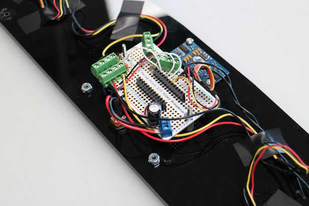 Diseñé la cabecera en Adobe Illustrator y corte de acrílico de 3 mm con un cortador láser. Los archivos fueron hechos para caber un láser con una cama amplia de tres pies. Sin embargo, es necesario utilizar un cortador láser. Simplemente quería tener agujeros poco triangulares frente a cada led en vez de la típica cara redonda. La cabecera consta de tres capas principales, una placa, medianas dos "alas" para los LEDs y una placa de base; éstos se intercalan con tornillos 6-32. El proto-board y el circuito de montaje a la parte posterior para una cara limpia. Cuatro varillas con espiga cuadrada 18" se enroscan en la placa posterior en orden de la unidad para descansar en un estante, pero podría substituir con clavos o ganchos si se desea que la unidad colgada en una pared posterior.