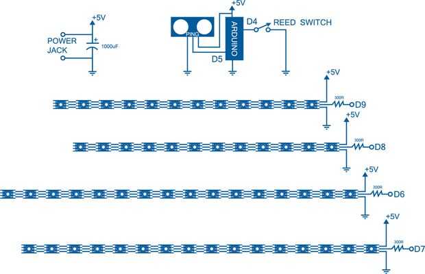 El esquema es bastante sencillo ya que la mayor parte del circuito se compone de módulos pre-ensamblados. Los componentes sólo discretos son las resistencias a los pines digitales en las cadenas de NeoPixel y un fornido condensador electrolítico 1000 uF a través de los carriles de la energía. Los LED se dividen en cuatro segmentos, dos tramos de 16 LEDs extendidos a tres pies para la cabecera y dos tramos de 12 LEDs a doce pies para cada franja de suelo. He utilizado bloques de terminales para conectar las cadenas externas de NeoPixel y alimentación; Esto facilita la instalación con los cables más cortos y permite a desmontaje rápido de la unidad.