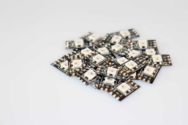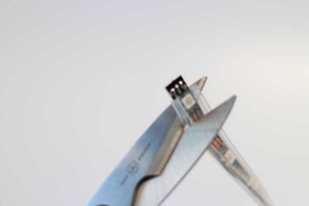 Cortar la tira de NeoPixel en unidades individuales a lo largo de la mitad de los rastros de cobre. Los nuevos bordes almohadilla de cobre de la lata.